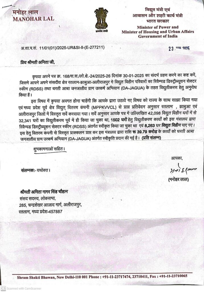परिणाम स्वरूप आम जनमानस ने बहुमत के साथ सांसद के रूप ने श्रीमती अनिता चौहान को वोट देकर जिताया और कैबिनेट मंत्री एवं सांसद ने भी अपने वादे को पूरा करते हुए रतलाम झाबुआ अलीराजपुर के विद्युत विहीन 8263 परिवारों के लिए धरती आबा जनजातीय ग्राम उत्कर्ष अभियान अंतर्गत 39.79 करोड़ रुपए स्वीकृत कर दिया। इस संबंध में केंद्रीय विद्युत मंत्री श्री मनोहर लाल ने सांसद श्रीमती अनिता चौहान को पत्र लिख कर राशि स्वीकृत होने की जानकारी दी।