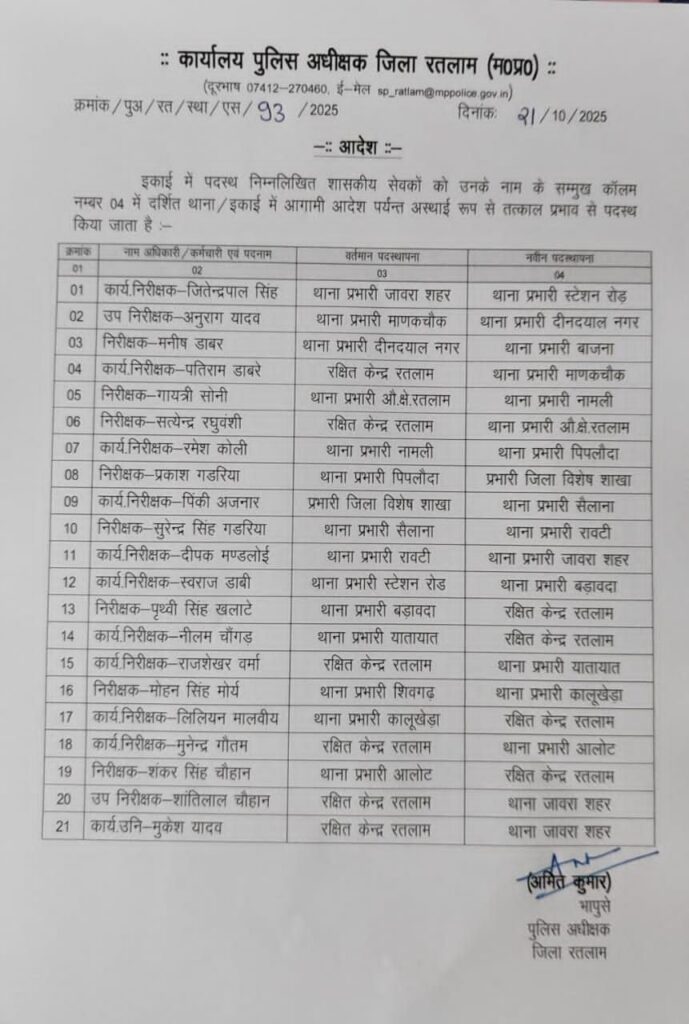 रतलाम। रतलाम जिले के पुलिस अधीक्षक अमित कुमार ने पुलिस थाना प्रभारियों के तबादले का आदेश जारी किया है। जारी आदेश के अनुसार पुलिस विभाग में बड़ा फेरबदल किया गया है। जिले के 21 थाना प्रभारी इधर से उधर किए हैं।