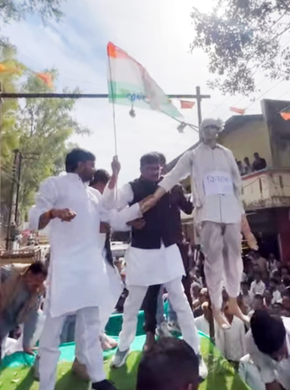 श्री गेहलोत के नेतृत्व में जिले में खाद उपलब्धता में भारी किल्लत, गड़बड़ी, बिजली और अन्य समस्याओं को लेकर कांग्रेस ने सोमवार को प्रदर्शन किया। प्रदर्शन में अनोखा विरोध देखने को मिला। ट्रैक्टर पर किसान का पुतला फांसी के फंदे पर लटकते हुए दिखाया गया। इससे किसानों की बदहाली की कहानी सुनाई गई। इसी जहांकी में दूसरा पुतला भी था, जिसे मुख्यमंत्री का मुखौटा पहनाया गया था। झांकी को रैली प्रारंभ स्थान पर ले जाते वक्त पुलिस प्रशासन द्वारा रोककर पुतले हटाने की बात कही यहां नगर परिषद अध्यक्ष एवं पुलिस प्रशासन की बहस् हुई।