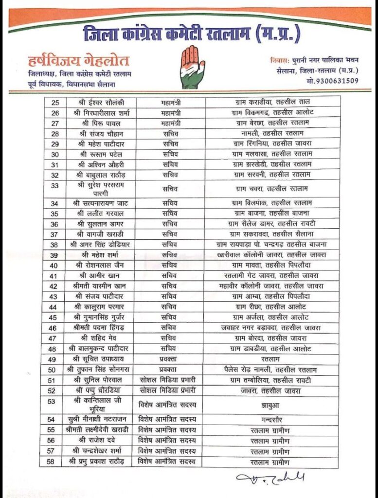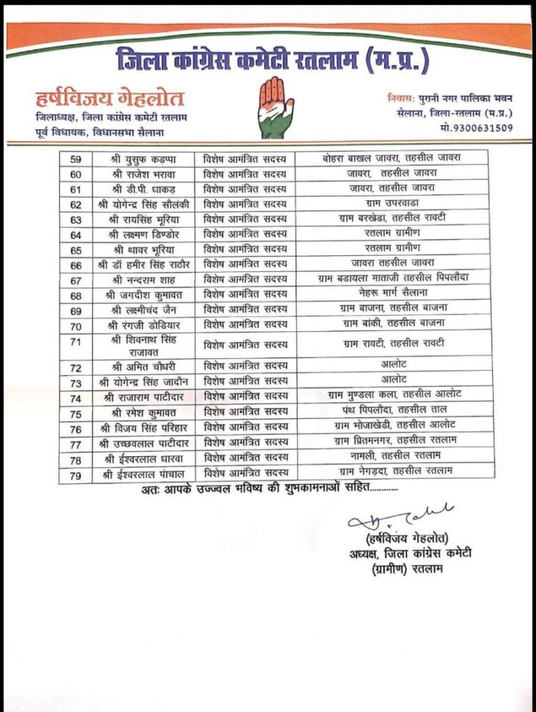 रतलाम जिला कांग्रेस कार्यकारिणी घोषित